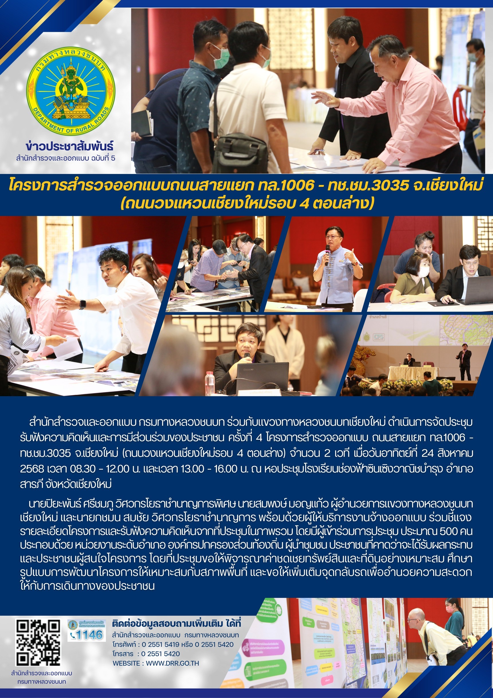 สำนักสำรวจและออกแบบ กรมทางหลวงชนบท ร่วมกับแขวงทางหลวงชนบทเชียงใหม่ ดำเนินการจัดประชุมรับฟังความคิดเห็นและการมีส่วนร่วมของประชาชน ครั้งที่ 4 โครงการสำรวจออกแบบ ถนนสายแยก ทล.1006 - ทช.ชม.3035 จ.เชียงใหม่ (ถนนวงแหวนเชียงใหม่รอบ 4 ตอนล่าง) จำนวน 2 เวที เมื่อวันอาทิตย์ที่ 24 สิงหาคม 2568 เวลา 08.30 – 12.00 น. และเวลา 13.00 - 16.00 น. ณ หอประชุมโรงเรียนช่องฟ้าซินเซิงวาณิชบำรุง อำเภอสารภี จังหวัดเชียงใหม