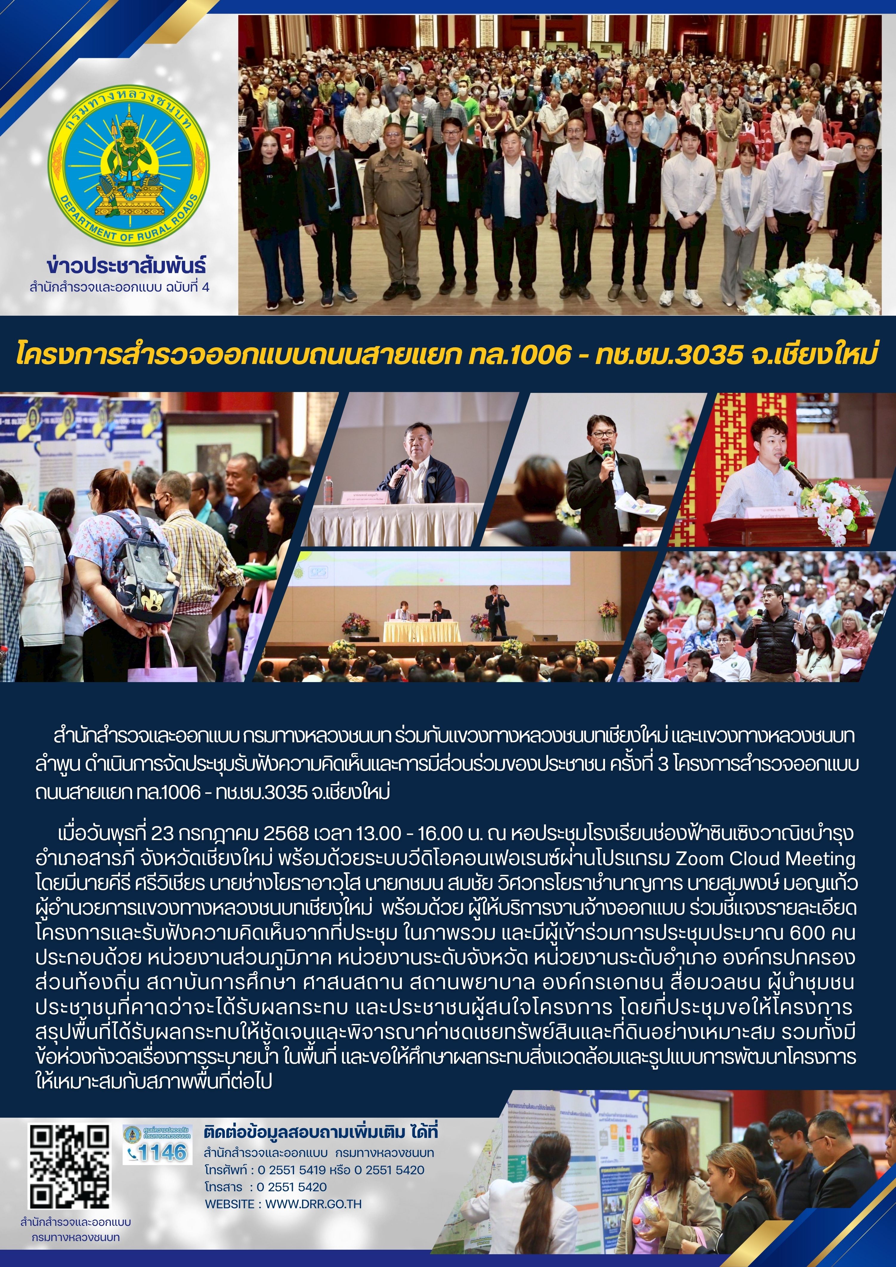 สำนักสำรวจและออกแบบ กรมทางหลวงชนบท ร่วมกับแขวงทางหลวงชนบทเชียงใหม่ ดำเนินการจัดประชุมรับฟังความคิดเห็นและการมีส่วนร่วมของประชาชน ครั้งที่ 3 โครงการสำรวจออกแบบ ถนนสายแยก ทล.1006 - ทช.ชม.3035 จ.เชียงใหม่ เมื่อวันพุธที่ 23 กรกฎาคม 2568 เวลา 13.00 - 16.00 น. ณ หอประชุมโรงเรียนช่องฟ้าซินเซิงวาณิชบำรุง อำเภอสารภี จังหวัดเชียงใหม่